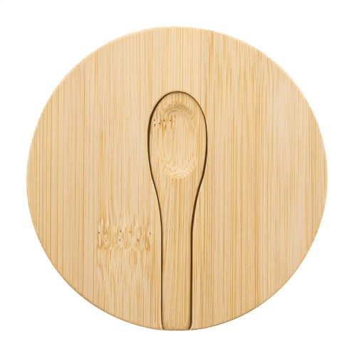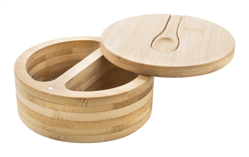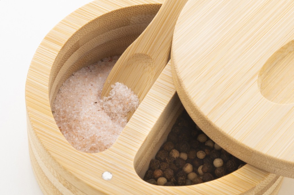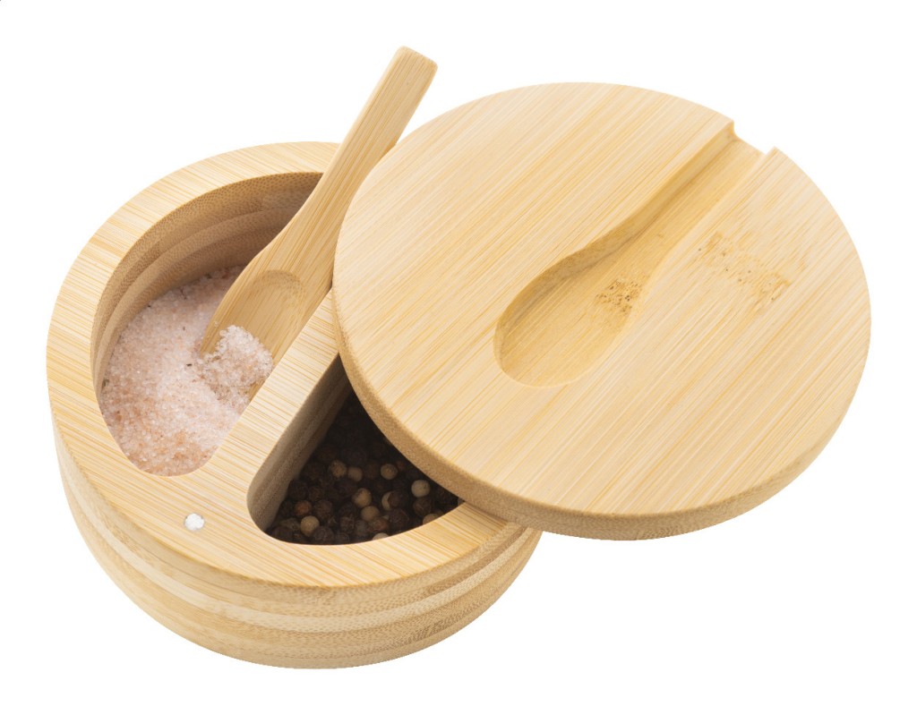 Bambuszból készült só- és borstartó doboz két rekesszel és mágneses tekerős tetővel. Beépített tálalókanállal.
