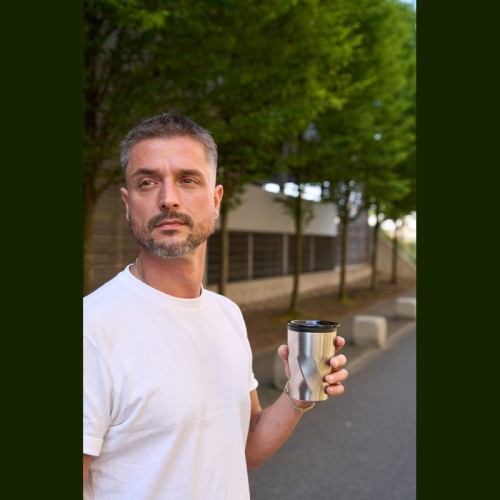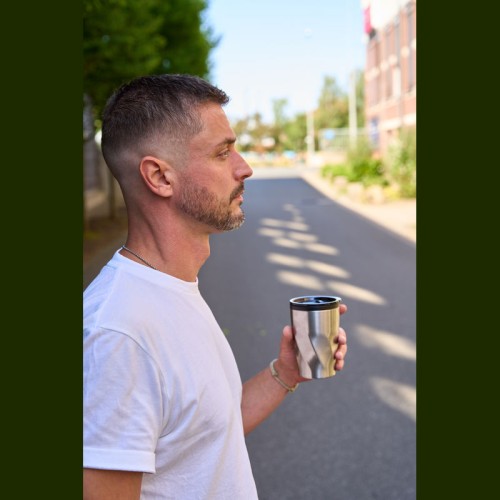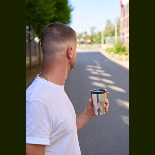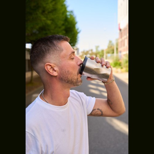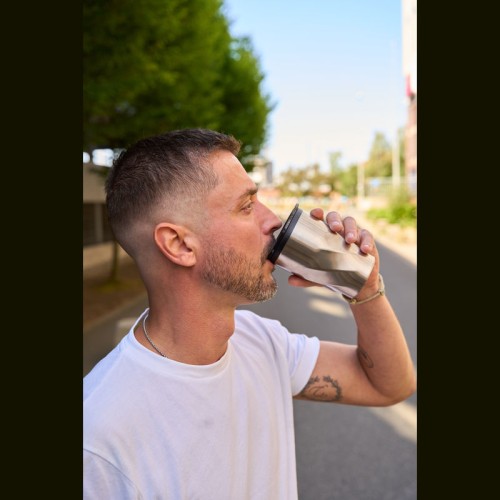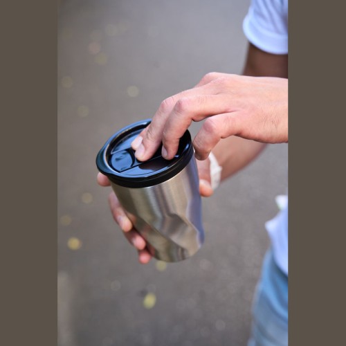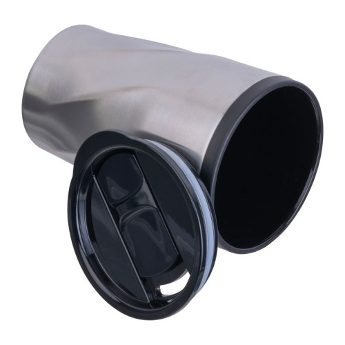 Duplafalú rozsdamentes acél utazóbögre műanyag (PP) belső résszel, amely csúsztatható fedéllel rendelkezik, és 350 ml űrtartalommal bír. A bögre szénsavas italok tárolására is alkalmas.