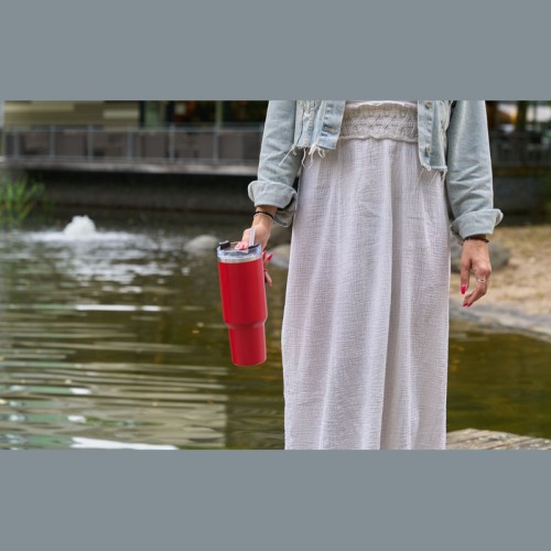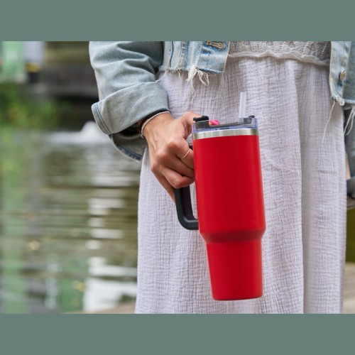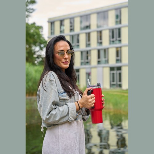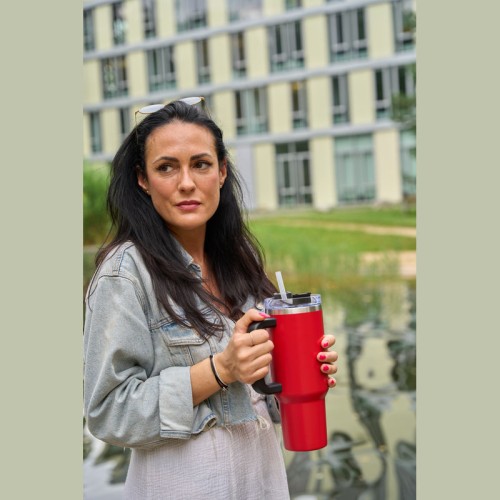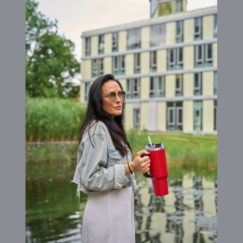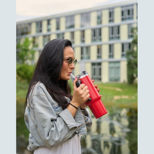1,2 literes BPA-mentes rozsdamentes acélból készült duplafalas vákuumszigetelt termosz, 2 órán át melegen és 4 órán át hidegen tartja az italokat. Újrahasználható szívószállal, ergonomikus markolattal. A kulacs illeszkedik a szokásos italtartókba.