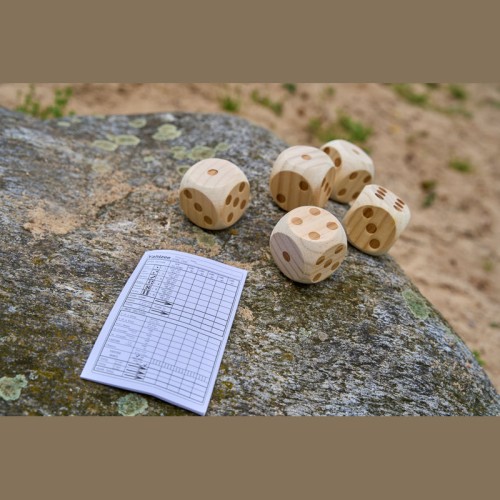 XXL kockapóker készlet, 5 fa dobókockából és egy praktikus vászonzsákból áll. Strapabíró és könnyen szállítható az órákig tartó játékélményhez.