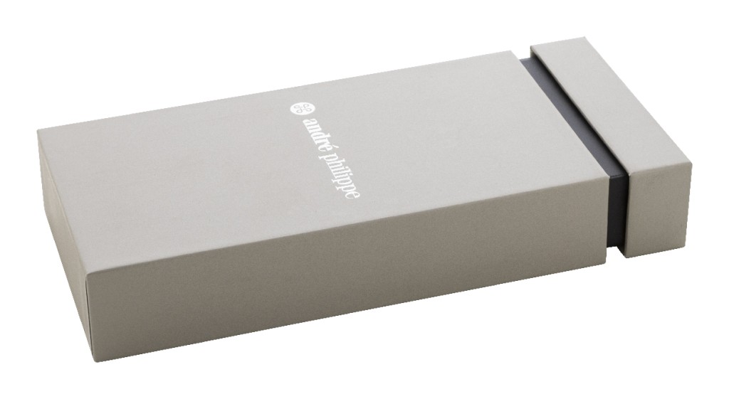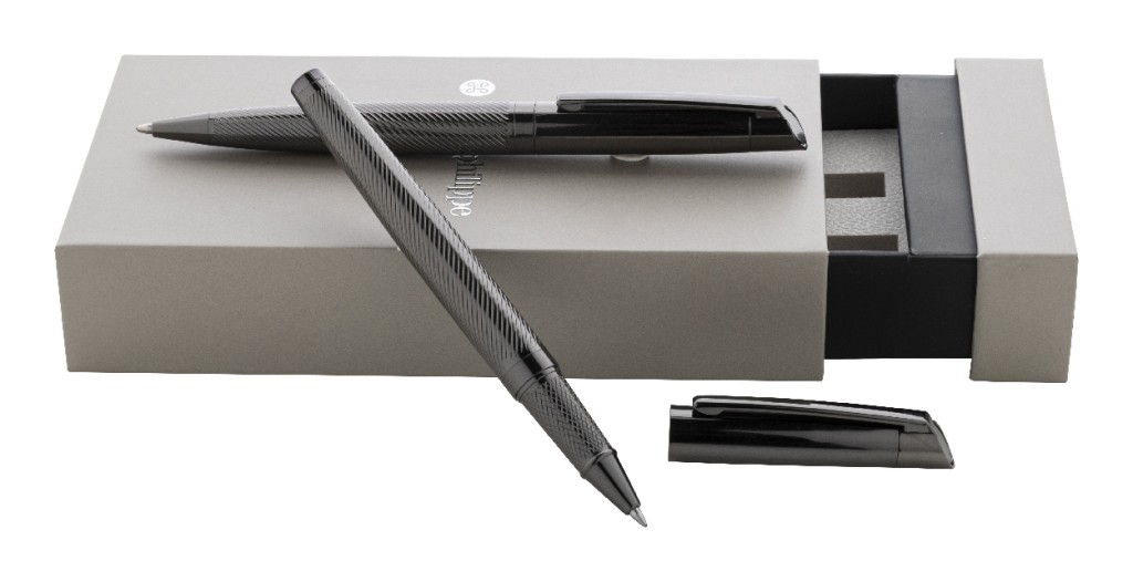 Elegáns, fém golyóstoll és rollertoll szett átlósan texturált testekkel. Kéttónusú ajándékdobozban, kék tollbetéttel. André Philippe márkatermék.