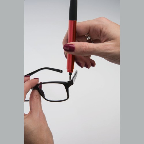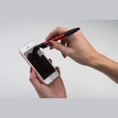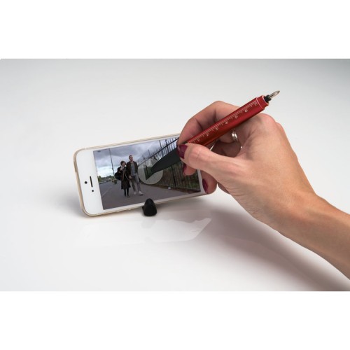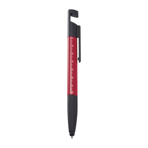 Műanyag golyóstoll kék tollbetéttel, érintőképernyős funkcióval, vonalzóval, mobiltelefon tartóval, kijelzőtisztítóval és csavarhúzóval felszerelve.