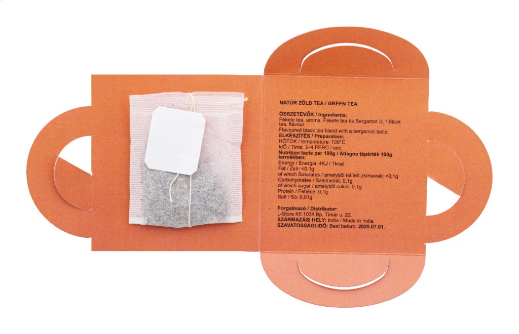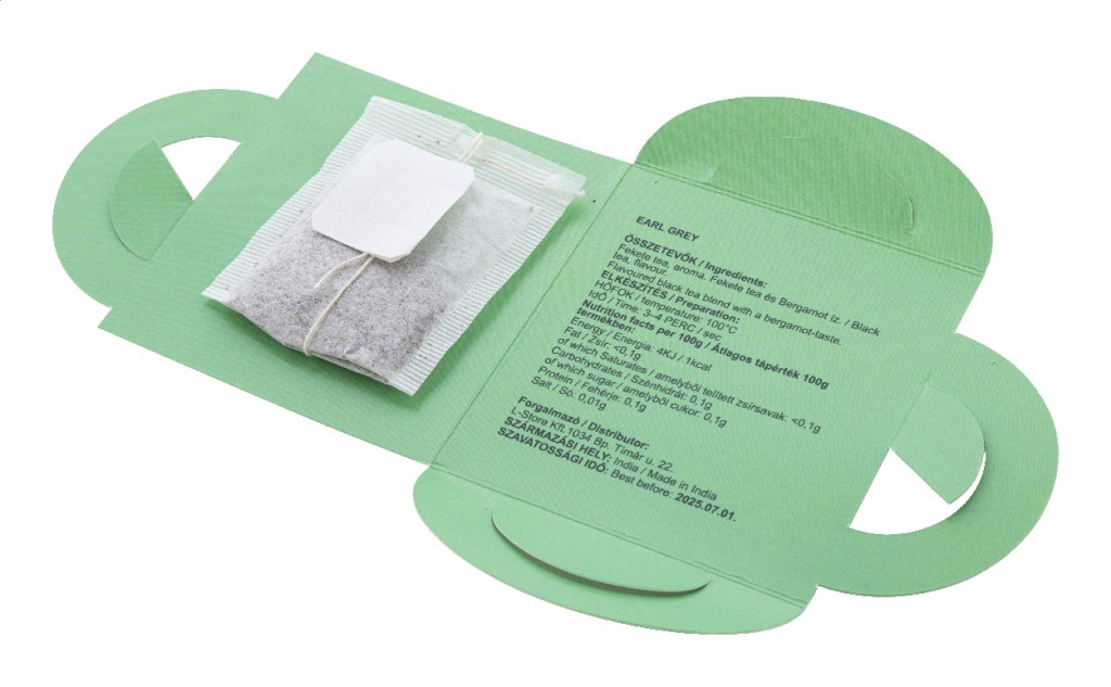 Egyenként csomagolt teafilter, egyedi gyártású, bögre formájú, full-colour nyomtatott papírtokban. 1,2 gramm (1 filter) teát tartalmaz. Minimális rendelési mennyiség: 100 db.