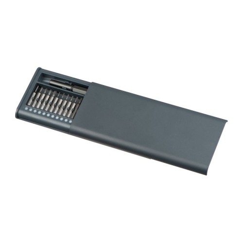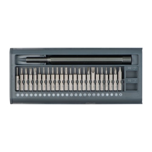 Szerszámkészlet 25 precíziós lapos, kereszt és Torx bitfejjel rozsdamentes acélból és mágneses tartóval. Kényelmesen nyitható csúsztatható műanyag dobozba csomagolva. A szettben helyet kapott egy magnetizáló és egy demagnetizáló mélyedés is.