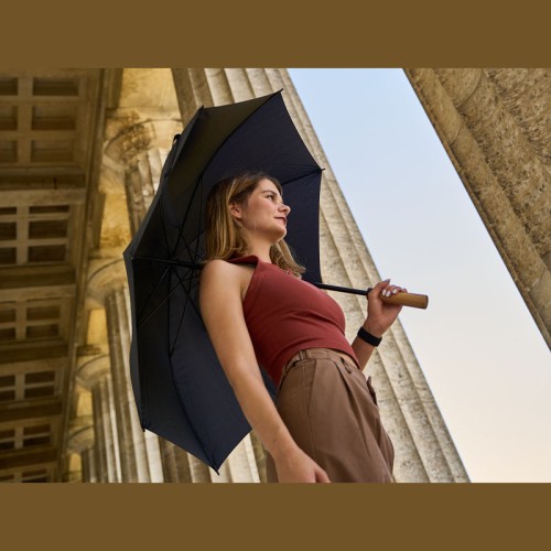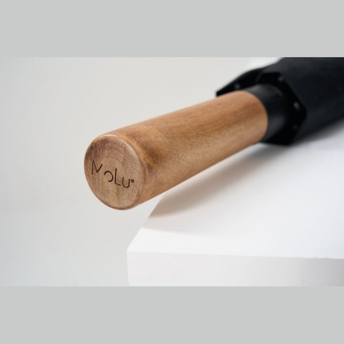 Klasszikus, 23 hüvelykes MoLu esernyő, amely stílust és funkcionalitást ötvöz tökéletes harmóniában. Ez a prémium esernyő automatikus nyitó mechanizmussal rendelkezik a könnyű kezelhetőség érdekében. A ponyva RPET anyagból készült, amely megbízható védelmet nyújt eső és szél ellen, míg a masszív üvegszálas bordák fokozott tartósságot biztosítanak. Az elegáns, akácfából készült markolat kifinomult megjelenést kölcsönöz, és kényelmes fogást garantál. Ez az esernyő nemcsak praktikus társ a rossz időben, hanem vonzó promóciós ajándék is. 2 év garanciával.