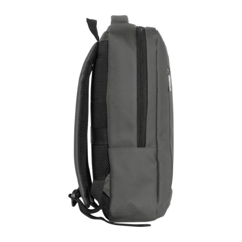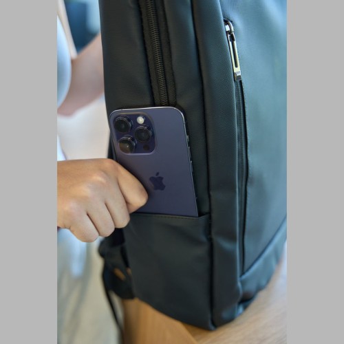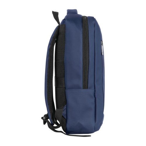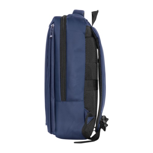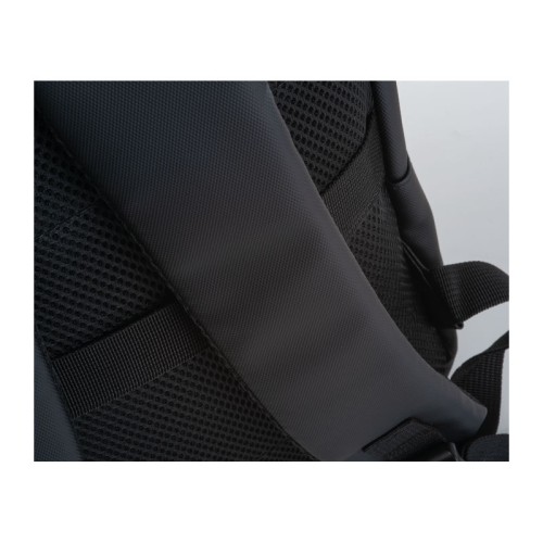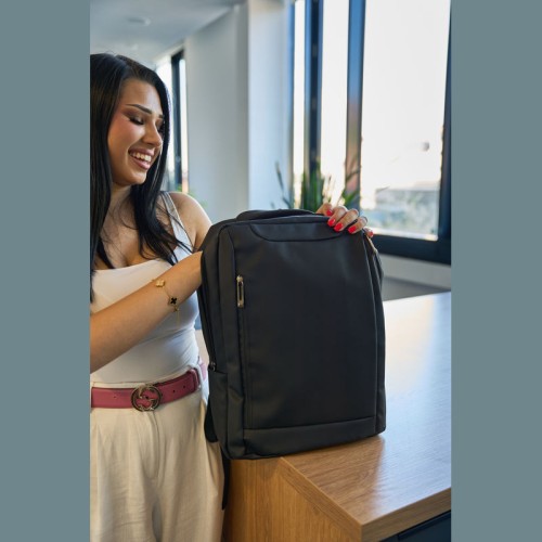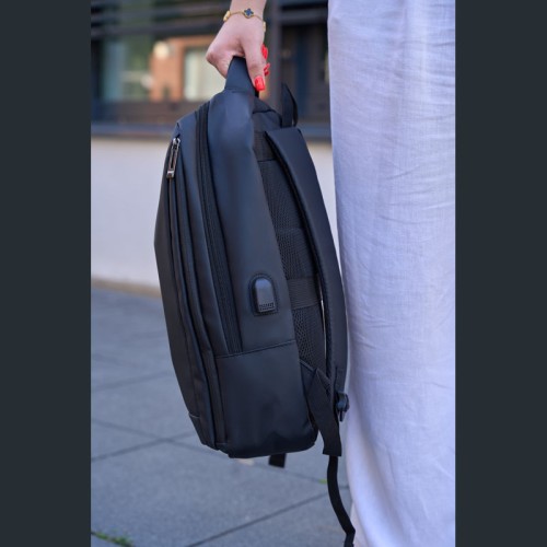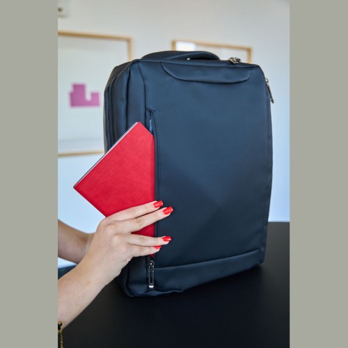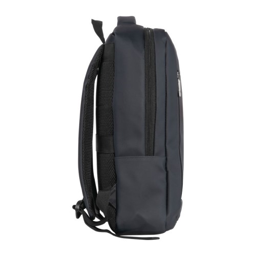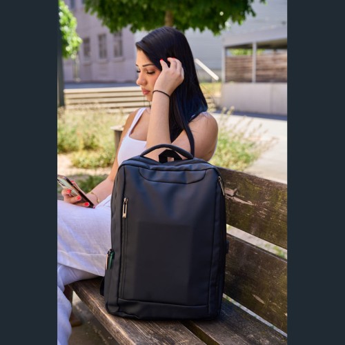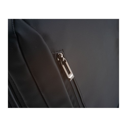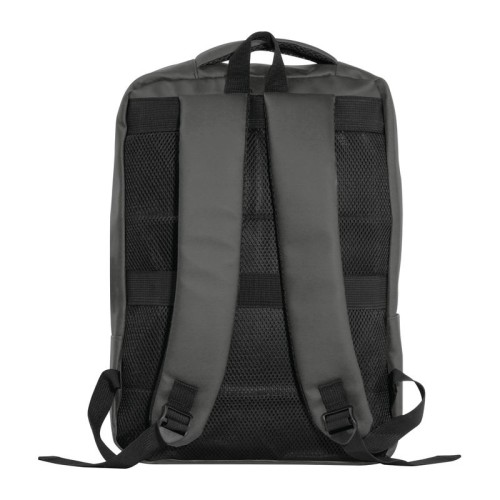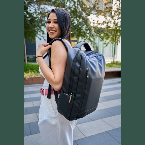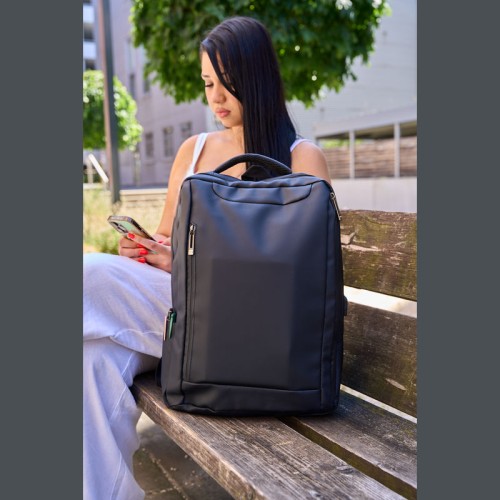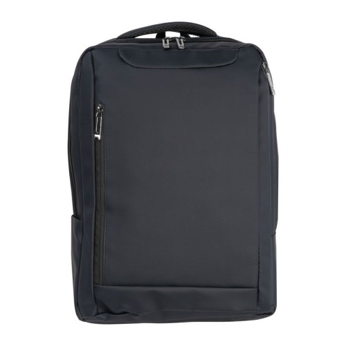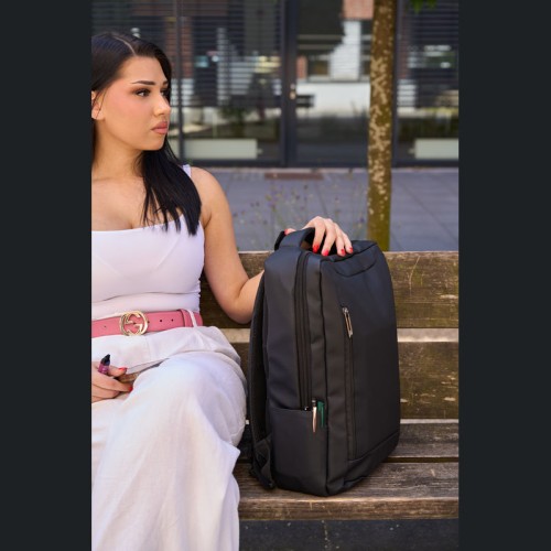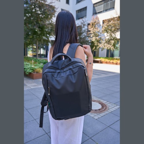 PU anyagból készült laptop hátitáska 15-16 hüvelykes laptopok számára. Két cipzáras első rekesszel, egy nagy párnázott főrekesszel a laptop részére, különféle belső zsebekkel, párnázott vállpántokkal, egy hordozófüllel és a hátoldalán bőröndpánttal rendelkezik, amely segítségével a bőröndre rögzíthető.
