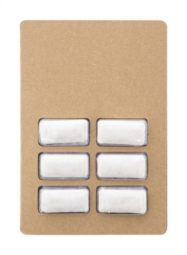 6 db cukormentes rágógumi bliszterben, egyedi gyártású, full-colour nyomtatott perforált kraft papírborítással. Minimális rendelési mennyiség: 100 db.