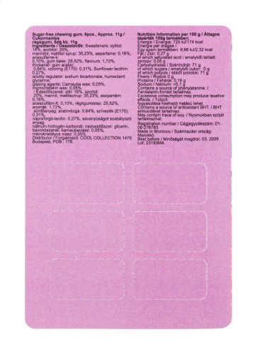 6 db cukormentes rágógumi bliszterben, egyedi gyártású, full-colour nyomtatott perforált papírborítással. Minimális rendelési mennyiség: 100 db.