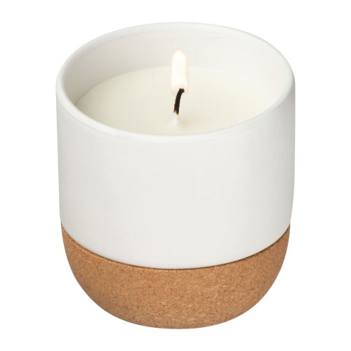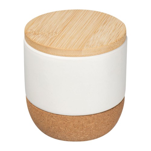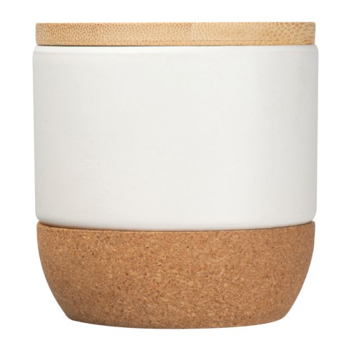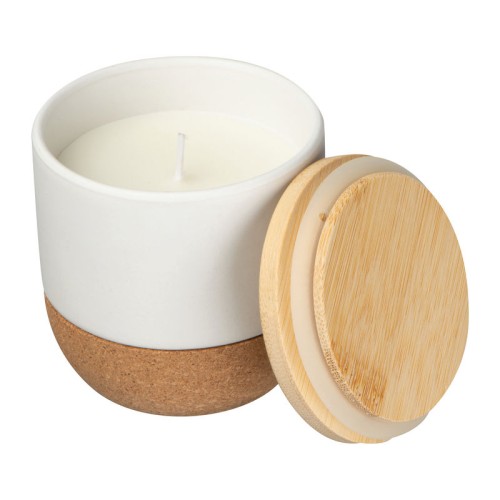 Elegáns gyertya kerámiatalapzaton, parafa aljjal és bambusz fedéllel. Stílusos kiegészítő, mely tökéletes a kellemes hangulathoz.